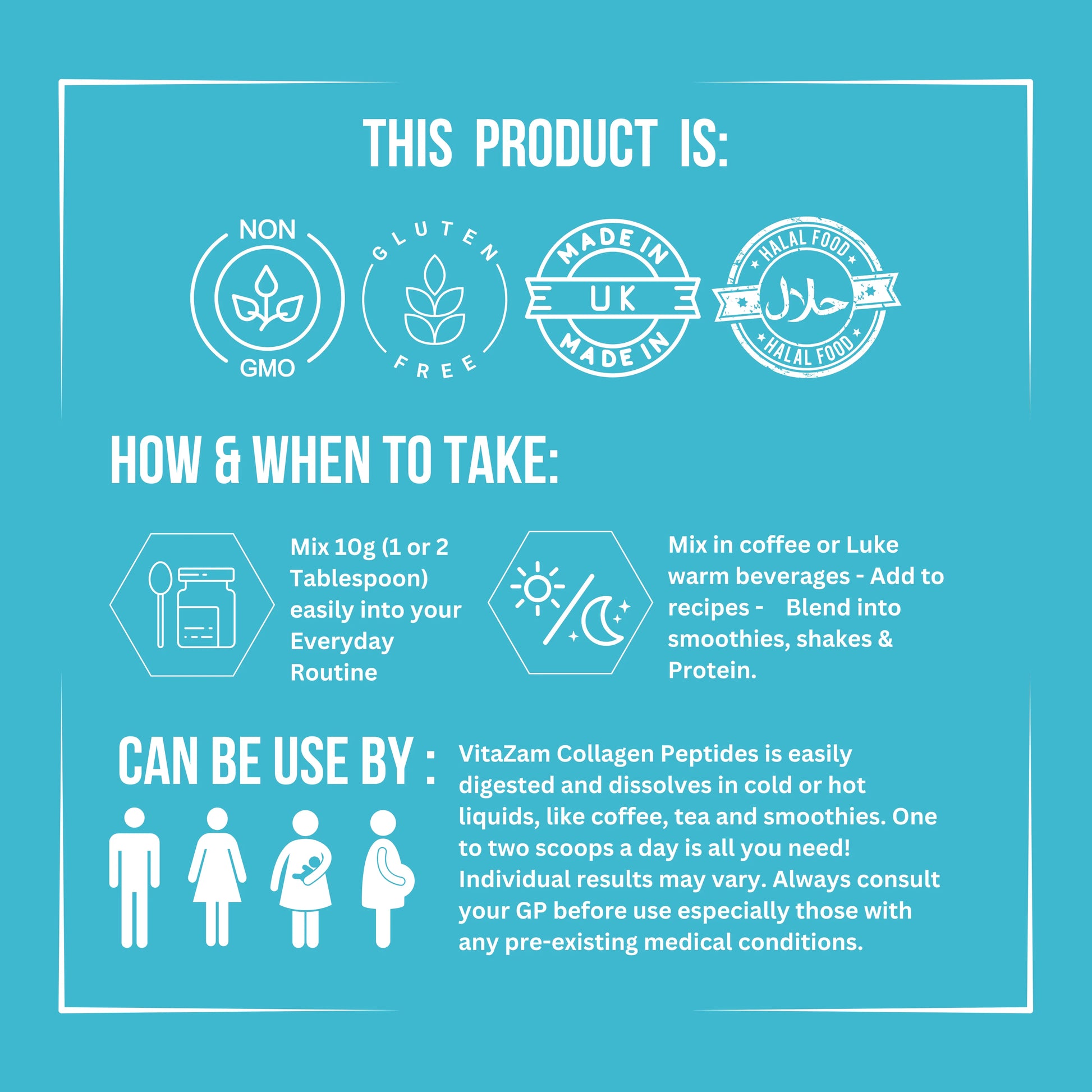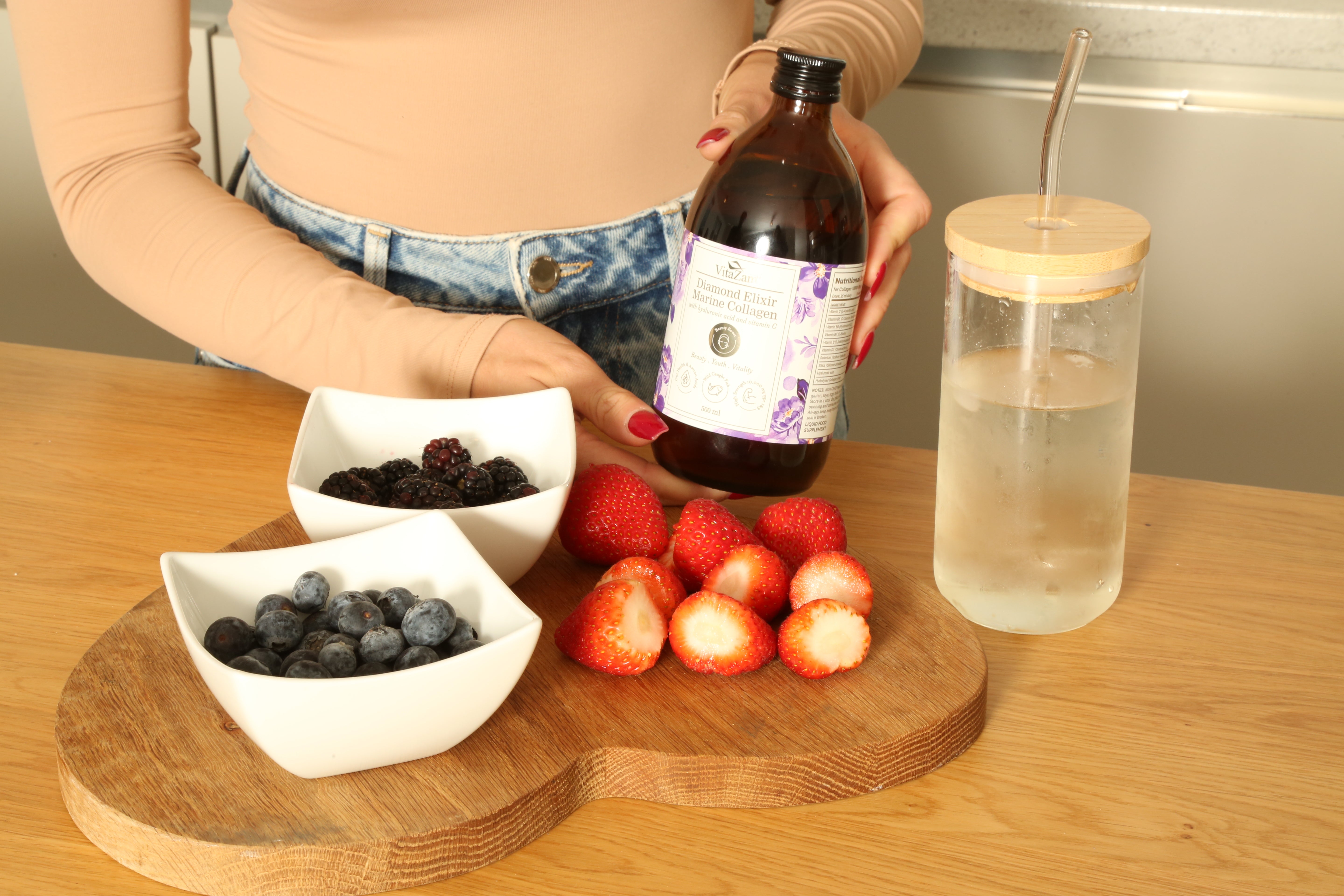 Simply mix two scoops daily into water, coffee, tea, or smoothies. Each serving delivers 5g of collagen peptides to support skin elasticity, stronger nails, thicker hair, and joint comfort.