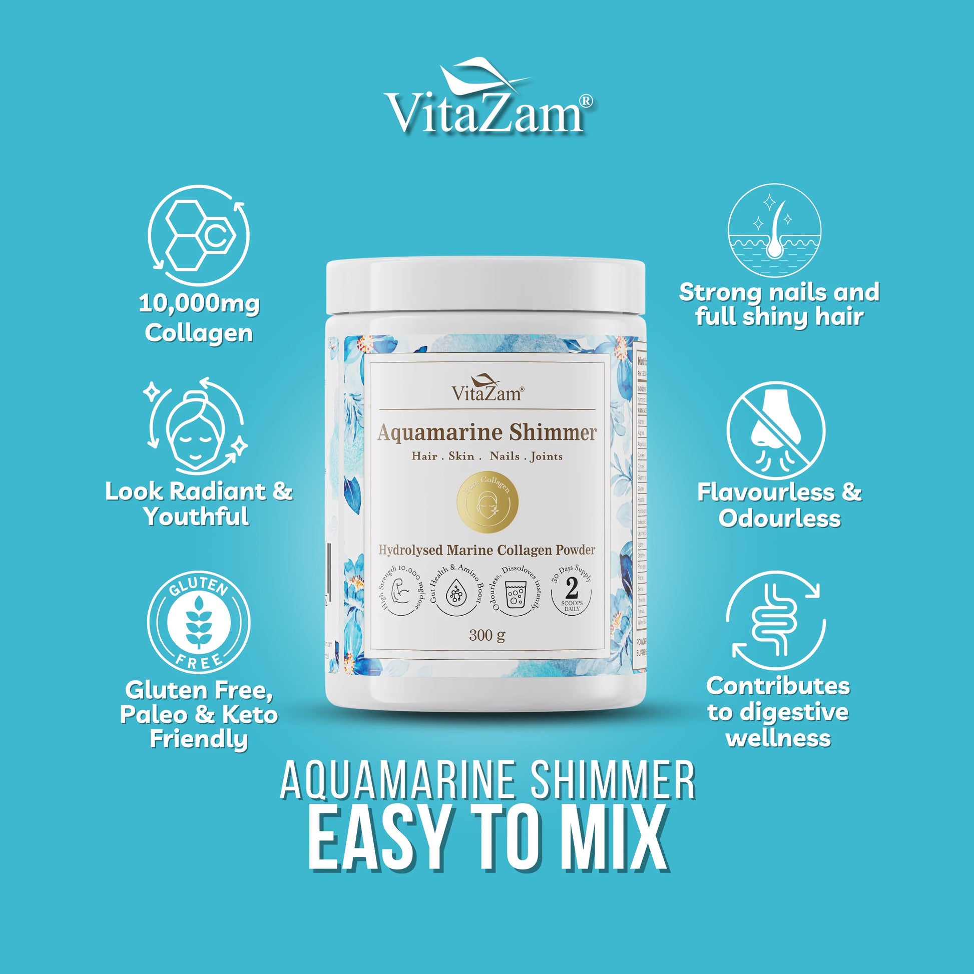PURE, FLAVOURLESS & SUGAR-FREE: Our Aquamarine Shimmer collagen peptides are unflavoured, sugar-free, and free from artificial colours or additives, making them the perfect choice for anyone looking for a clean marine collagen powder UK. Easily mix into smoothies, coffee, or water without altering the taste.