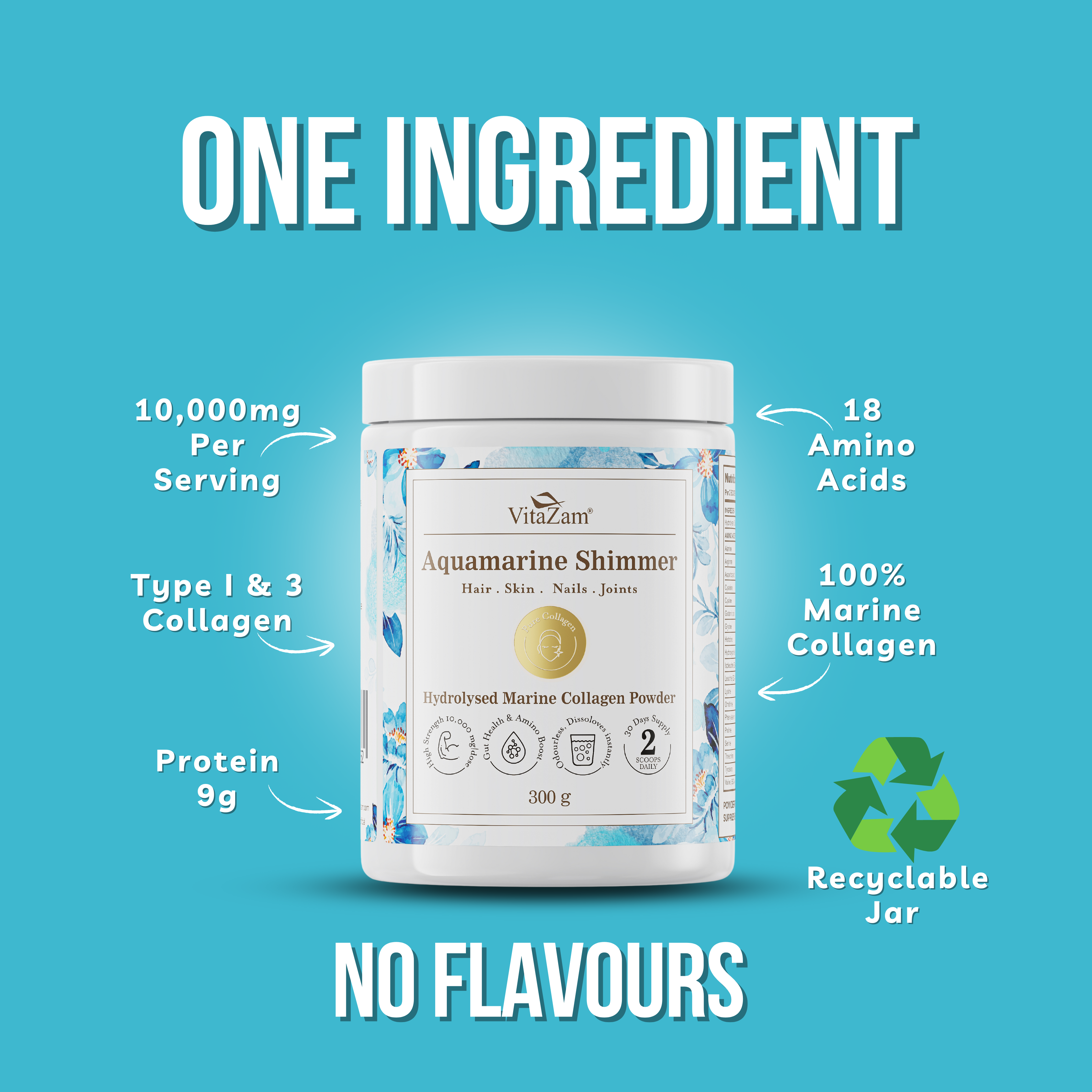 Aquamarine Shimmer contains 100% Pure Wild-Caught Marine Collagen Peptides (Type I & III) — 10,000mg per serving, providing 18 essential amino acids and 9g of natural protein.