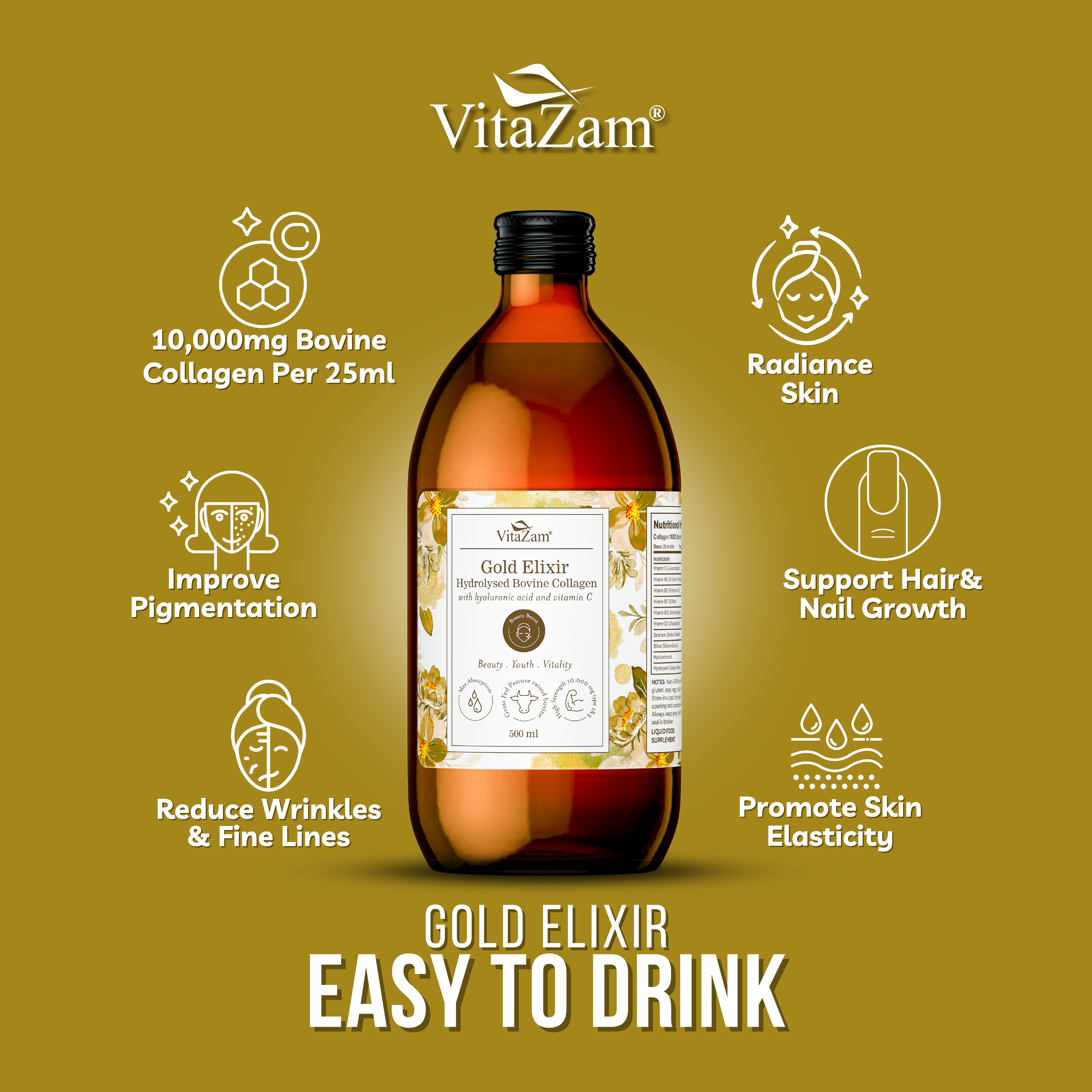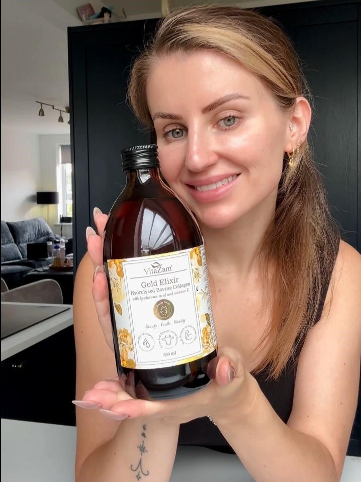 Each 25ml shot of VitaZam Gold Elixir Bovine Collagen delivers 10,000mg of types I & III collagen peptides, supporting the body’s natural collagen production. This high-strength liquid collagen formula is far more effective than standard collagen capsules, tablets, or gummies, helping to promote smoother skin, stronger nails, healthier hair, and flexible joints.