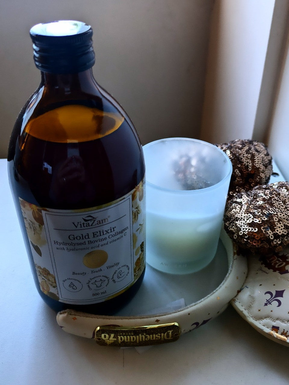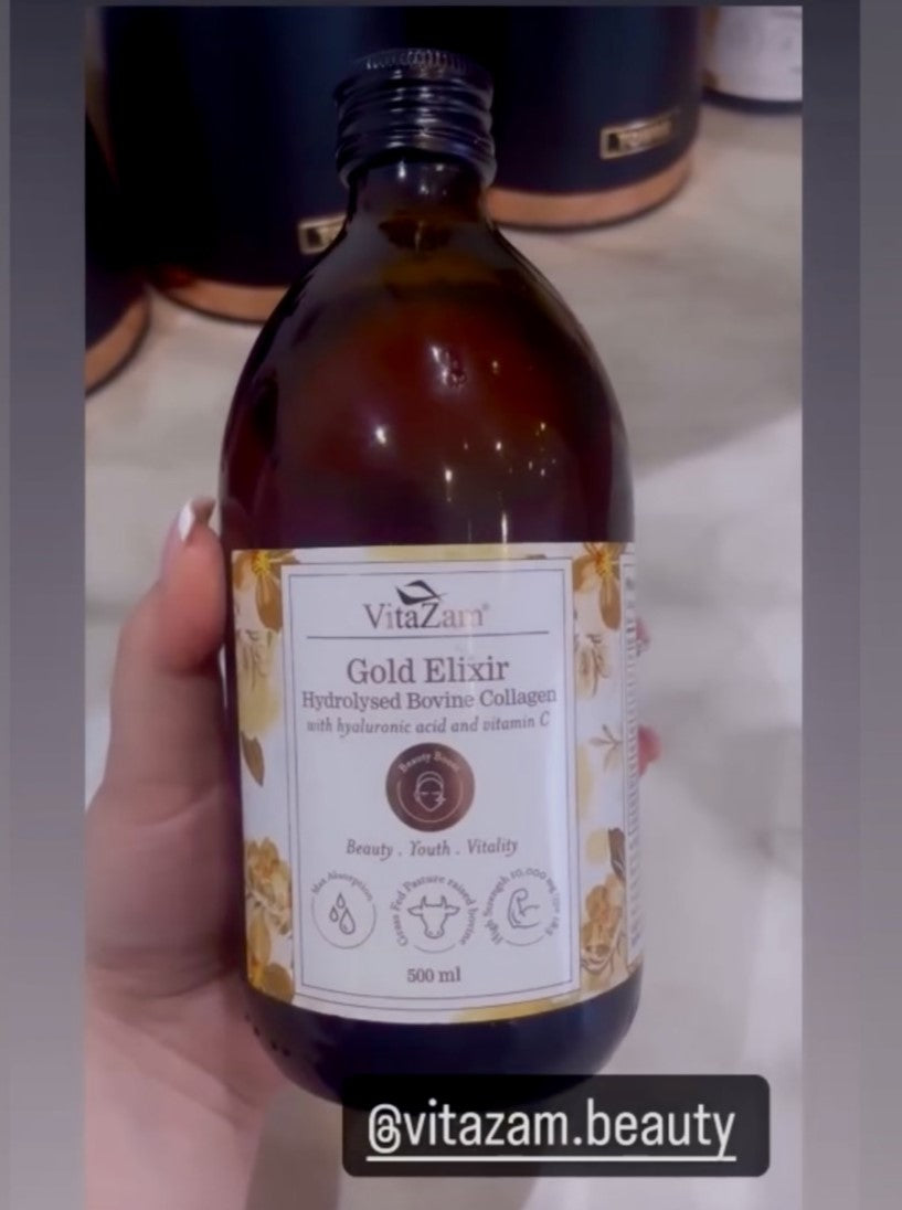 Gold Elixir contains 10,000mg Grass-Fed Bovine Collagen Peptides, 60mg Vitamin C, 50mg Hyaluronic Acid, 1500mcg Biotin, 25mcg Silica, 2.5mcg Vitamin B12, 1.15mg Vitamin B6, and Natural Berry Flavour.