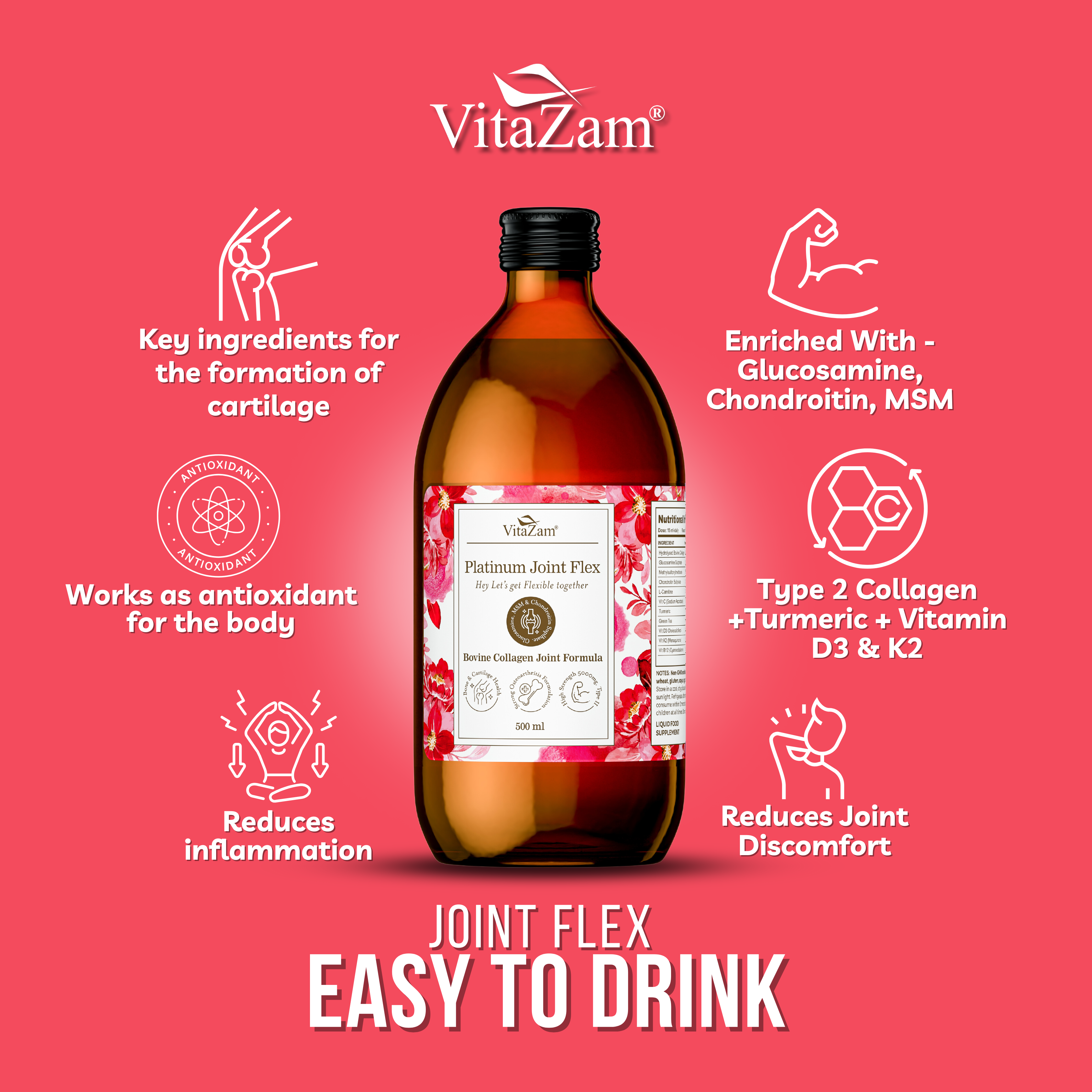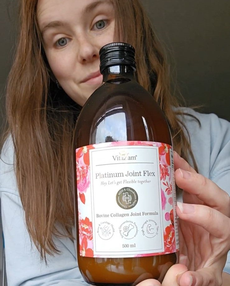 Joint Flex contains Type 2 Bovine Collagen (5000mg), Glucosamine & Chondroitin Sulphate, MSM (Methylsulfonylmethane), Vitamins D3, K2 & C, Liquid Turmeric, and Natural Berry Flavour.