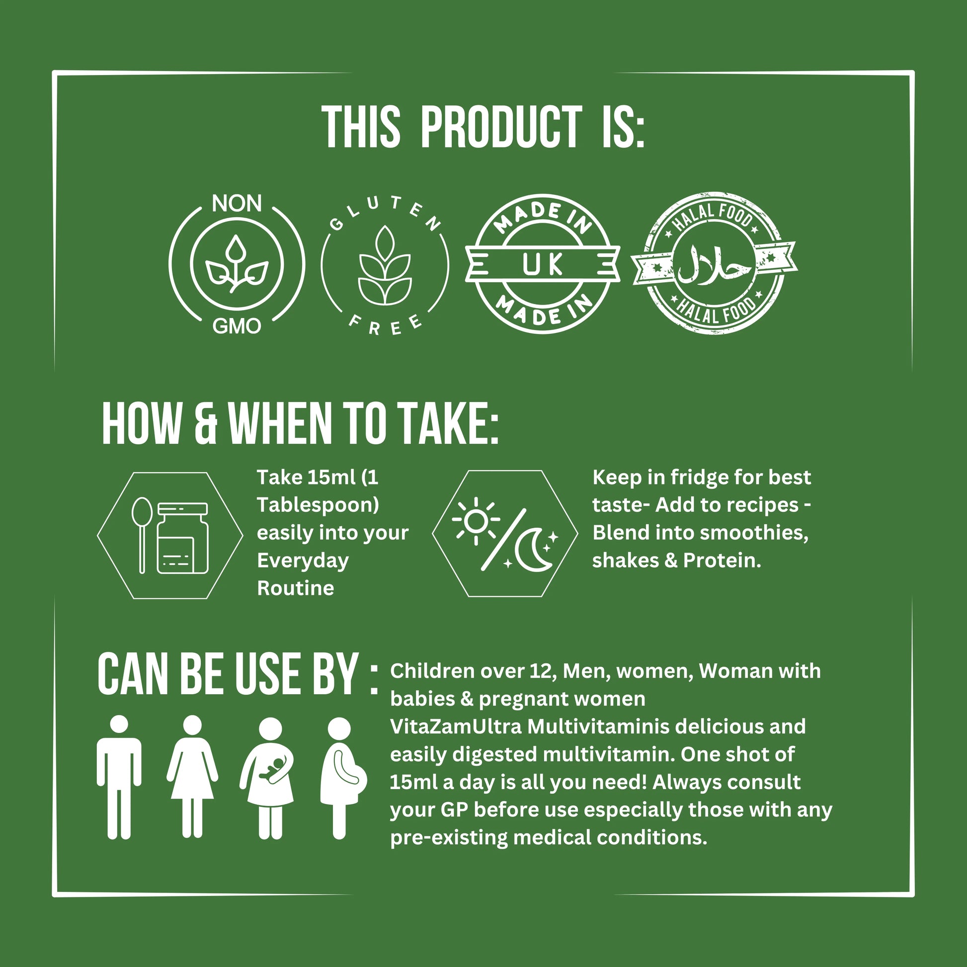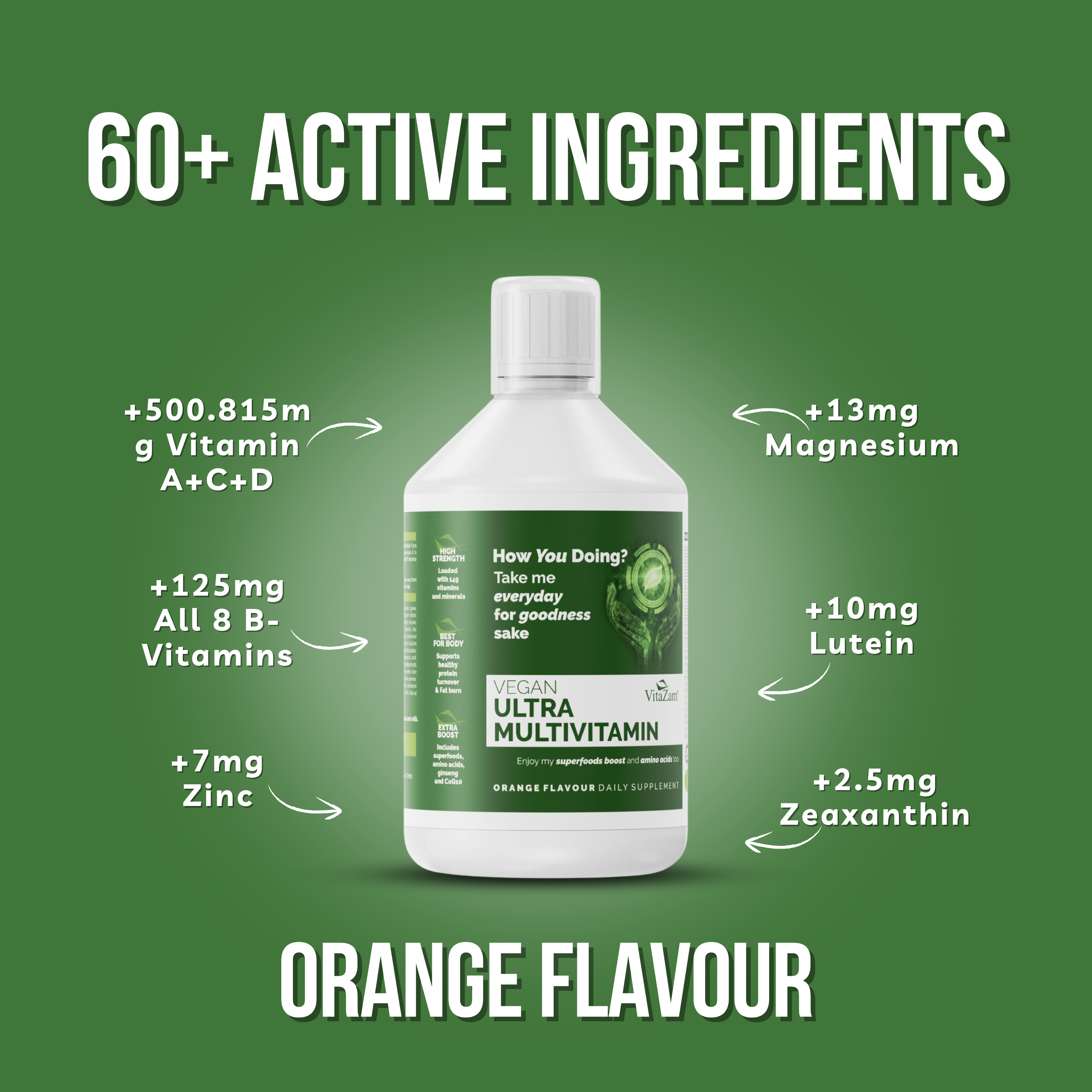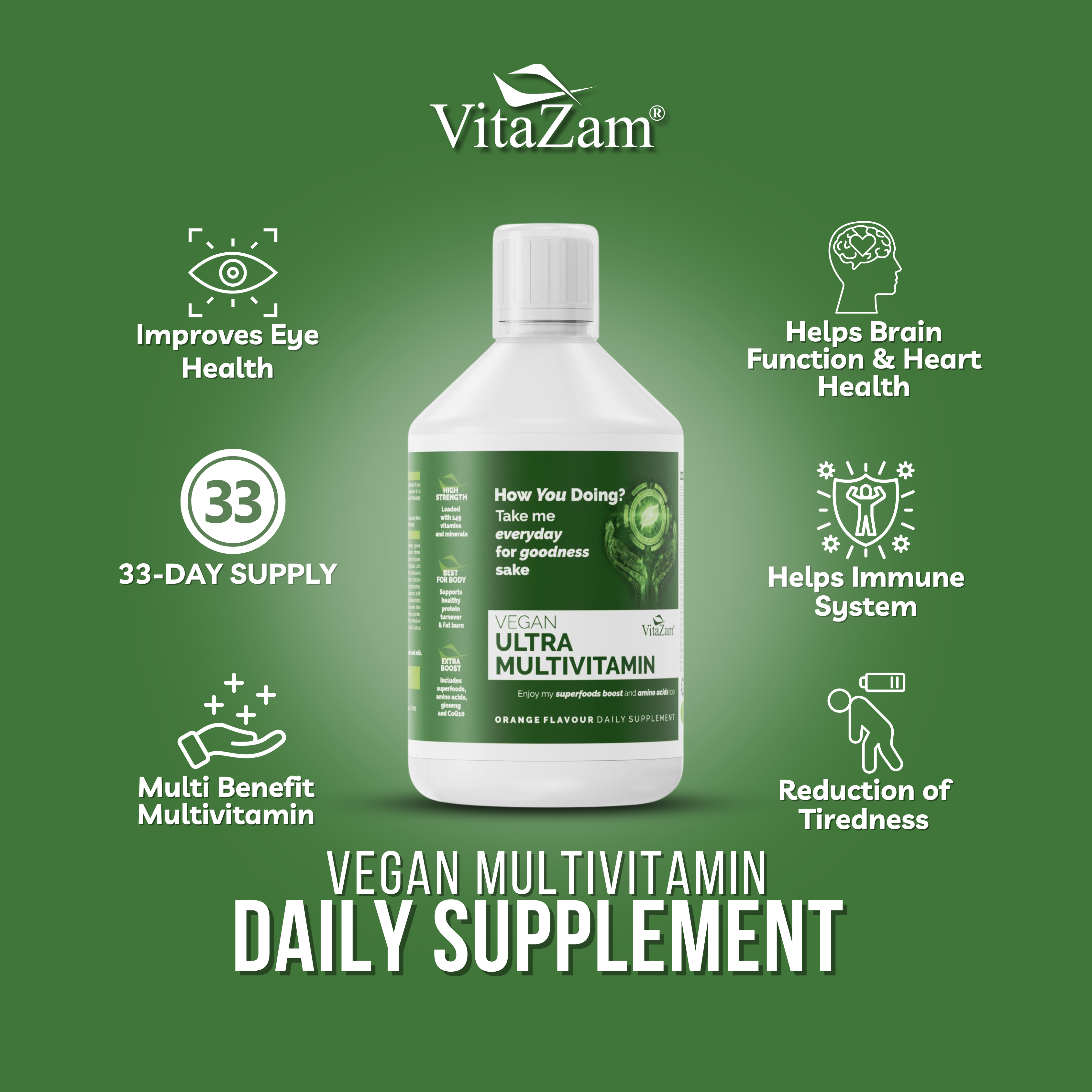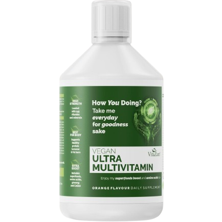 ADVANCED LIQUID MULTIVITAMIN UK: Vitazam Ultra Liquid Multivitamin 500ml delivers a complete blend of superfood greens, CoQ10, Lutein, and Biotin to support heart health, brain function, energy, and immunity in one daily dose.